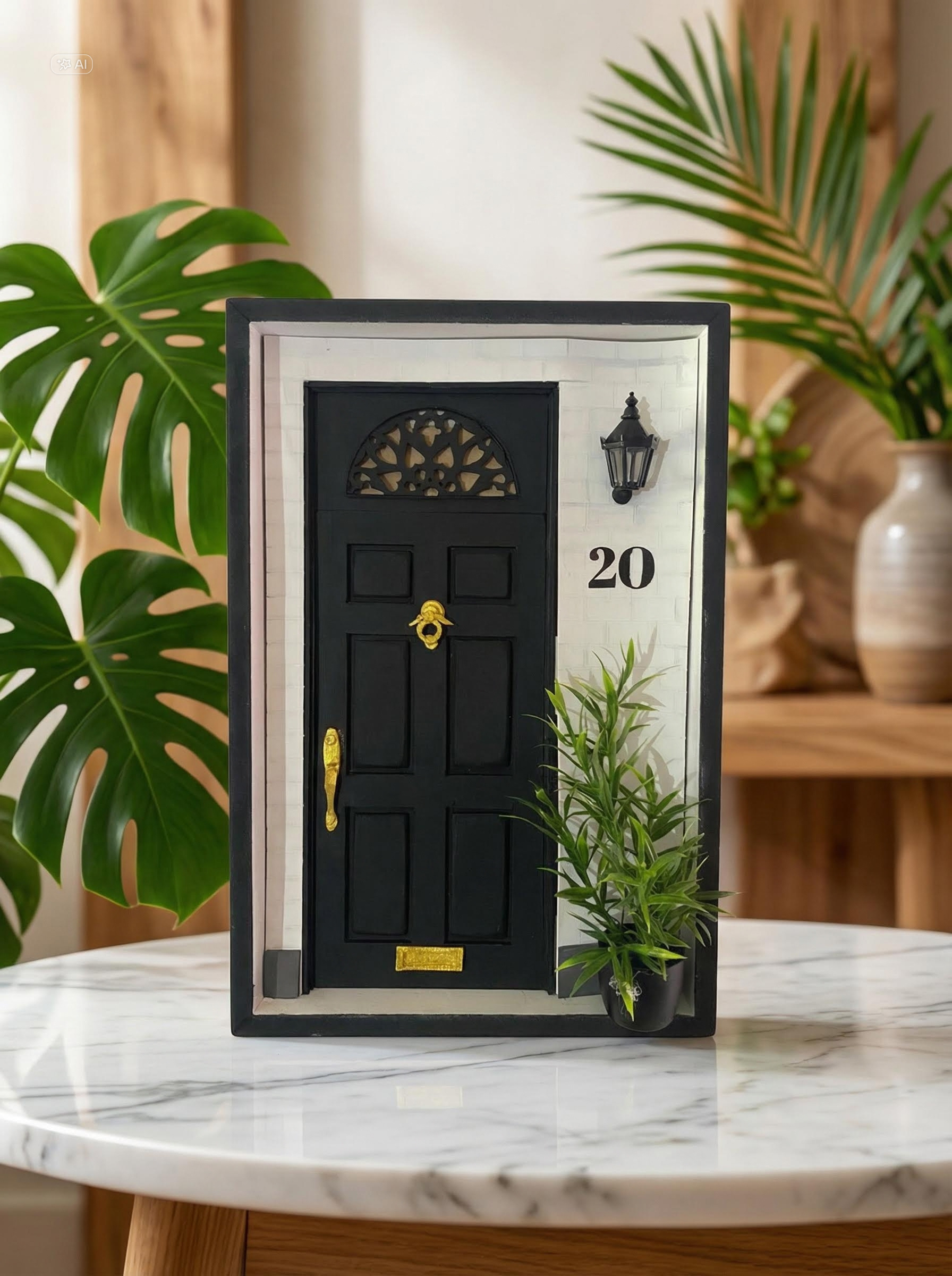 Acepté el reto de salir de mi estilo rústico habitual para capturar esa sofisticación urbana. Me enfoqué en el contraste limpio entre el negro profundo de la puerta y el brillo de los herrajes, el número '20' y el pequeño buzón. Trabajar en la reja superior y el farol fue un ejercicio de precisión para lograr que, incluso en miniatura, se sienta la historia y la sobriedad de esa arquitectura europea. Es mi forma de decir que la belleza de una entrada no tiene fronteras.